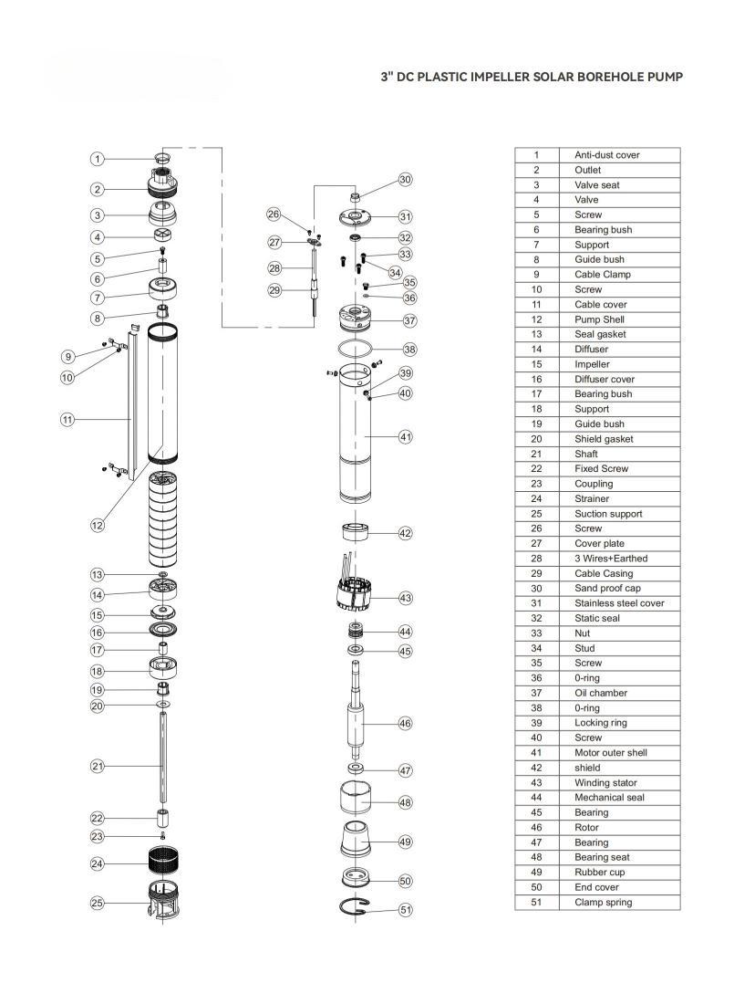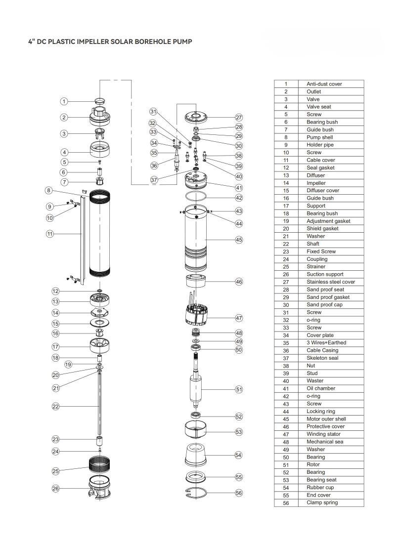 Pompa sumur bor surya menggunakan energi matahari untuk memompa dan mengalirkan air. Pompa ini dibenamkan ke dalam air. Pompa ini merupakan cara paling menarik untuk memasok air di wilayah-wilayah yang cerah saat ini, terutama di daerah-daerah terpencil yang minim listrik. Pompa submersible kami terutama digunakan untuk pasokan air domestik, irigasi pertanian, air minum ternak, pompa sumur dalam dan sumur bor, dll.