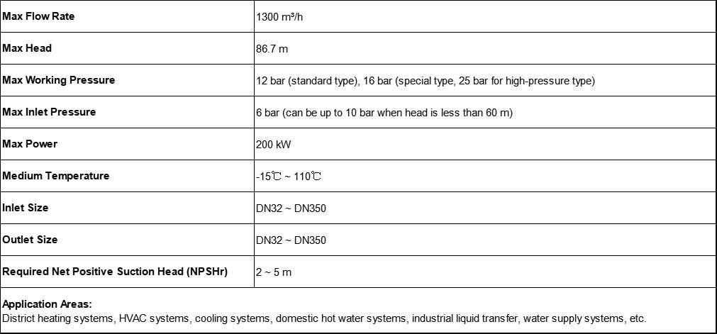 The TD300~TD350 pump series features a dual-suction impeller design. Its symmetrical structure effectively balances axial forces, ensuring smooth operation and significantly boosting efficiency—up to 84%. With high energy efficiency and low noise, it is ideal for reliable transportation of large-volume fluids.