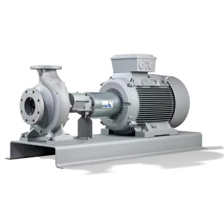 Pompa casing volute horizontal dengan desain tarikan belakang, satu tahap, dengan peringkat dan dimensi sesuai EN 733, casing volute terbagi radial dengan kaki pompa cor integral, cincin aus casing yang dapat diganti, impeller radial tertutup dengan bilah melengkung ganda, segel mekanis tunggal sesuai EN 12756, segel mekanis ganda sesuai EN 12756, bantalan ujung penggerak: bantalan elemen gelinding, bantalan ujung pompa: bantalan polos, dengan motor KSB SuPremE tanpa magnet (pengecualian: ukuran motor 0,55 kW / 0,75 kW dengan 1500 rpm dirancang dengan magnet permanen) dengan kelas efisiensi IE4/IE5 dan sistem kecepatan variabel PumpDrive; tersedia versi yang mematuhi ATEX.