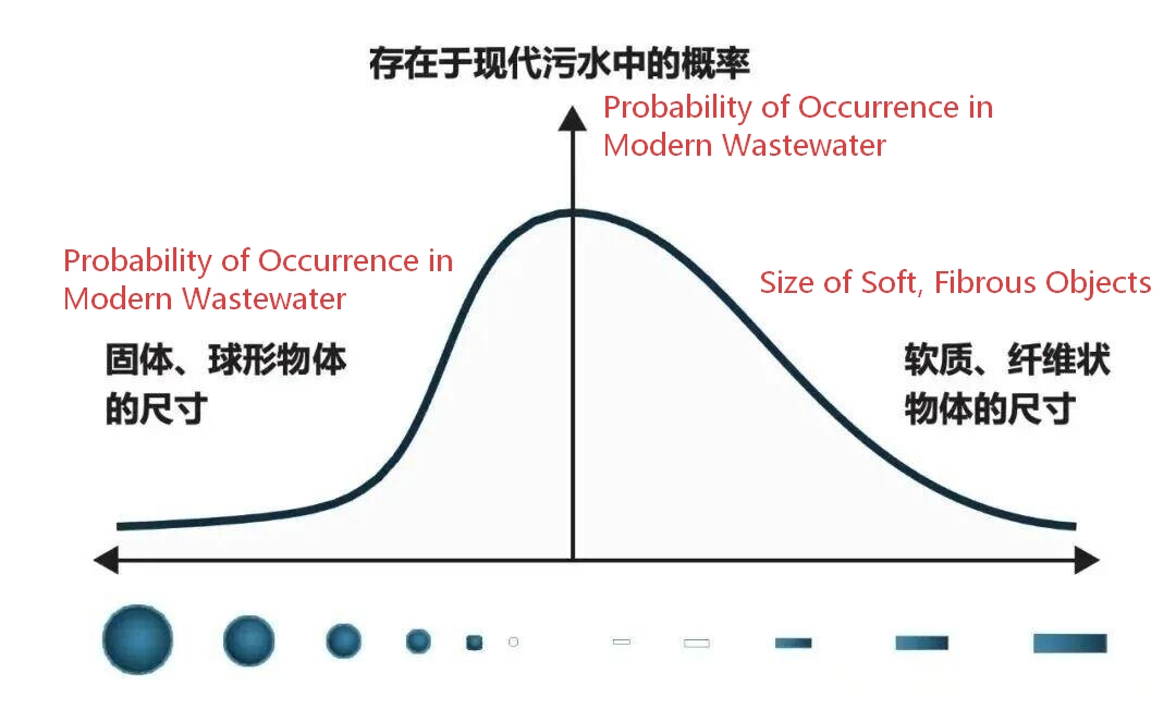 Gambar 1 merupakan ilustrasi konseptual tentang kemungkinan ditemukannya berbagai jenis padatan dalam air limbah. Benda keras yang hampir bulat berada di sebelah kiri, sementara benda lunak yang memanjang berada di sebelah kanan. Seperti pada banyak sistem lainnya, probabilitas ditemukannya benda yang sangat besar (baik bulat maupun memanjang) sangat rendah. Ciri penting lainnya adalah kurva distribusinya yang asimetris—kurva ini lebih menyukai benda lunak yang memanjang, yang merupakan jenis paling umum yang ditemukan dalam air limbah saat ini.