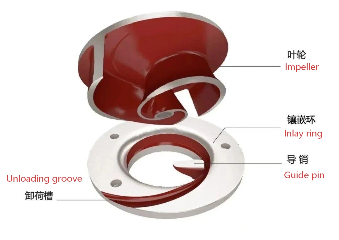 2. Alur pembongkaran pada cincin sisipan bekerja sama dengan tepi depan horizontal untuk mengarahkan zat padat keluar dari impeler.