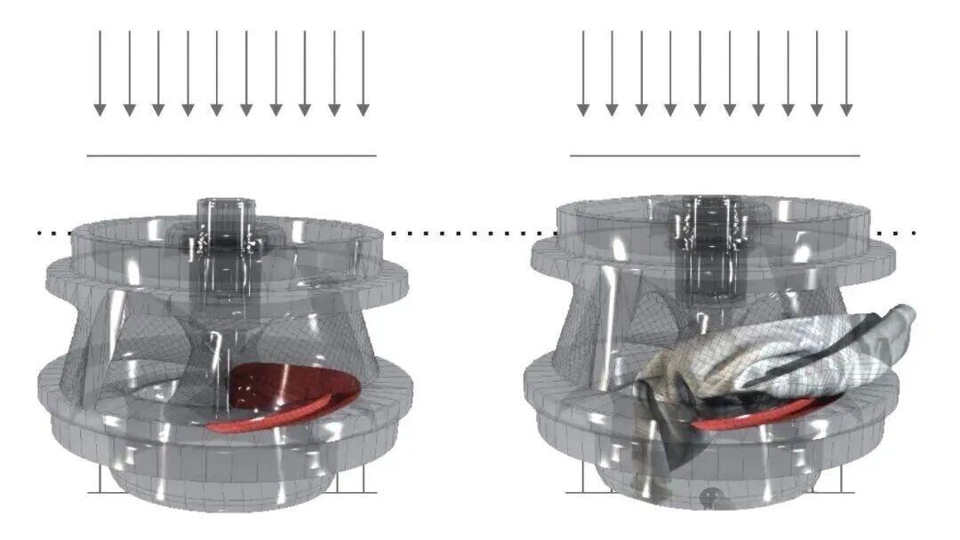 Sisi kiri Gambar 10 merupakan gambaran konseptual tekanan hidrolik yang terdistribusi di seluruh impeller dalam air limbah yang sedikit terkontaminasi. Di dasar impeller, tekanan ke atas meningkat seiring dengan radiusnya, sehingga gaya meningkat dari pusat impeller ke arah tepi. Sementara itu, di bagian atas impeller, tekanan yang lebih tinggi bekerja secara merata di seluruh cakram impeller. Gaya total yang bekerja pada impeller memiliki nilai total ke bawah, yang menjaga impeller pada posisi operasi normalnya.