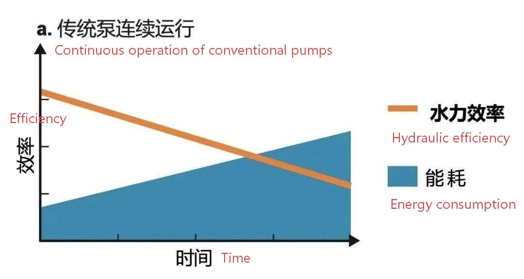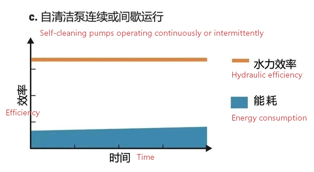 Seperti ditunjukkan pada Gambar 11a, ketika pompa konvensional dioperasikan secara terus-menerus dalam air limbah, efisiensinya menurun dan konsumsi energinya meningkat secara bertahap. Tren yang sama diamati ketika pompa konvensional dioperasikan secara berkala (Gambar 11b), meskipun pencucian balik dapat meningkatkan efisiensi untuk sementara. Sebaliknya, Gambar 11c menunjukkan bahwa pompa pembersih mandiri mempertahankan efisiensi dan konsumsi energi yang konsisten selama operasi berkelanjutan maupun berkala dalam air limbah, sehingga menghasilkan konsumsi energi terendah seiring waktu.