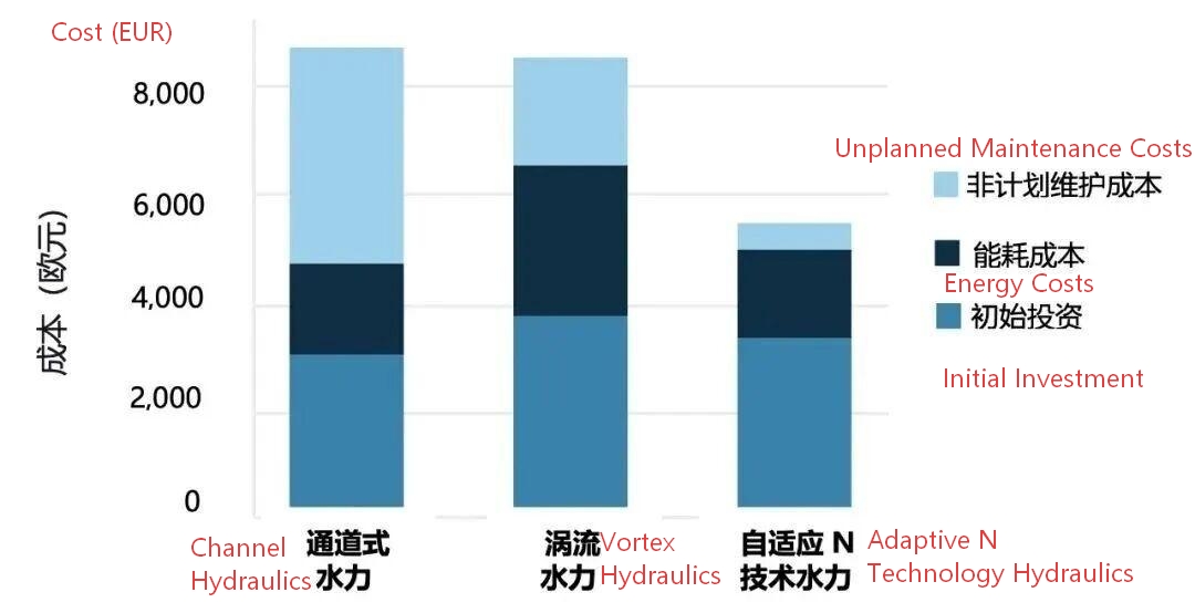Lebih lanjut, analisis LCC menunjukkan potensi penghematan biaya yang signifikan untuk pompa impeller Adaptif N. Umumnya, penghematan ini berasal dari konsumsi energi yang lebih rendah dan biaya perawatan tak terencana yang lebih rendah.