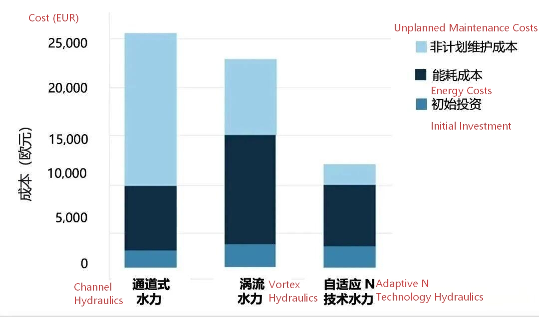 Ketika pompa impeller kanal dioperasikan 12 jam per hari selama lima tahun (Gambar 14), biaya perawatan tak terencananya melebihi lima kali lipat investasi awal. Sebaliknya, biaya perawatan pompa impeller tipe-N adaptif hanya 60% dari investasi awalnya. Meskipun pompa impeller vortex diperkirakan membutuhkan lebih sedikit perawatan dibandingkan pompa impeller kanal, efisiensinya yang lebih rendah dibandingkan desain hidraulik lainnya akan mengakibatkan biaya energi yang lebih tinggi. Hal ini bahkan belum memperhitungkan biaya energi tambahan yang disebabkan oleh penyumbatan ringan, yang sulit diprediksi dan oleh karena itu tidak termasuk dalam perhitungan LCC atau diagram ini. Dengan mempertimbangkan hal ini, pompa hidraulik vortex akan memiliki konsumsi energi yang lebih tinggi dibandingkan kedua desain hidraulik lainnya.